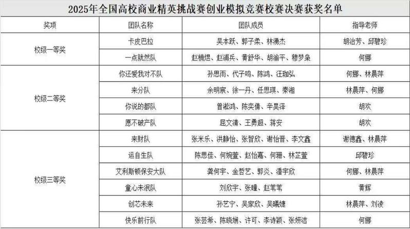 2025年全国高校商业精英挑战赛创业模拟厦门大学嘉庚学院校赛结果公示:经学校组织线下竞赛,现将晋级区域赛的参赛队伍名单公示如下 :公示期为6月5日至6月10日,如对公示结果有异议,请在公示期内以邮件或电话方式与校赛负责人联系。联系人:马心妍联系电话:15005034028联系邮箱:813117058@qq.com厦门大学嘉庚学院国际商务学院2025年6月5日