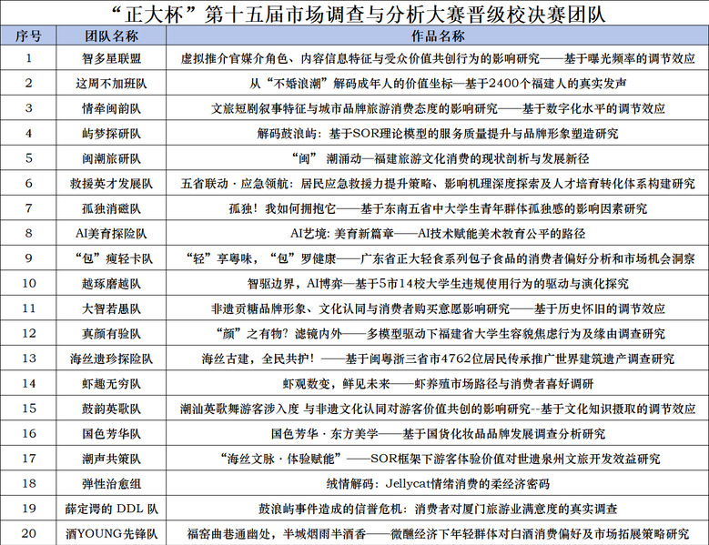 各位老师、同学:此次“正大杯”第十五届市场调查与分析大赛,我校共有411名同学通过知识赛,在校赛初赛阶段,校赛组委会共收到31份团队文本作品。校赛组委会对参赛同学进行资格审核,同时邀请评委进行文本评审,经过审核与评审,现公布以下团队晋级校决赛:校决赛将于2025年3月22日(周六)14:00在经管楼414举行现将具体安排及要求通知如下:一、比赛形式与时间安排1. 比赛形式:路演+答辩 路演时间:4分钟(工作人员在最后1分钟...