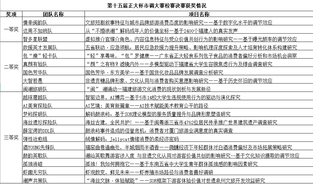 各位老师、同学:第十五届正大杯市场调查与分析大赛校赛决赛,于2025年3月22日在经管A414举行,晋级到校赛决赛的20支队伍进行现场路演、答辩,经评委对各个项目的文本、路演、答辩的评审,现公布校赛获奖情况:国际商务学院2025年3月22日