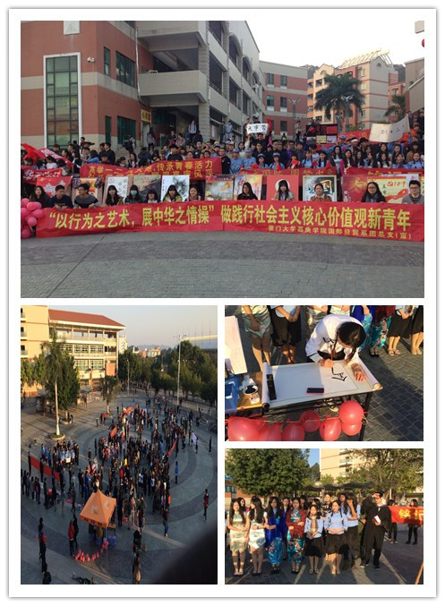 国际经贸系2013级和2014级各班同学积极响应,发挥创意,向过往师生展示了丰富多彩的艺术节目。其中2013级国贸三班以“为中华之崛起而读书”为主题,支部代表们穿上标志的学生装朗诵爱国诗篇,带动了现场气氛。2013级国商一班的表演也是独具特色,同学们穿上民国时期的旗袍,上演了“金陵十三钗”的短剧,场边还有行云流水的书法展示,吸引了众多师生围观。新生们也毫不逊色,2014级国商一班打出“流逝年华无法还,长存唯有爱国心”的横幅,配有四幕情景剧,生动形象地展现了那个年代的学生在街头游行时的爱国情怀以及老百姓积极参与抗日的勇气与决心。2014级市营的同学们进行了“我把青春献给社会主义祖国”的才艺展示,让爱国情操在二胡和笛子的共鸣中,悠悠传扬。此外,现场还举办了爱国主题签名活动,嘉庚学子们积极参与,展现了当代青年“不忘国耻,圆梦中华”的精神。