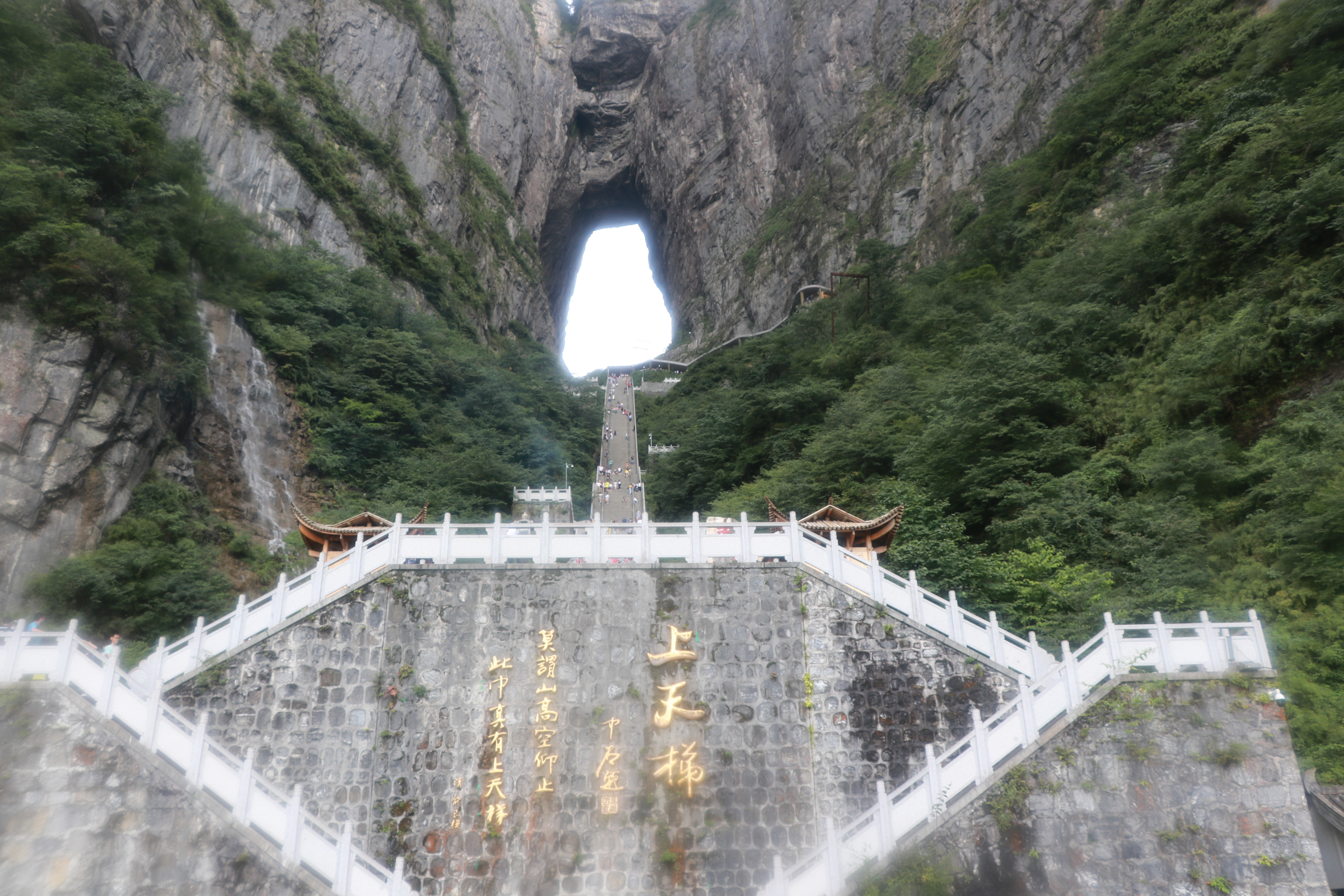行到天门山洞口下,只需抬头便可看见类似央视“大裤衩”的山体,而其往下就是有着九百九十九阶台阶之称“天梯”,沿天梯而下,这骇人的高度顿时改变了人的身体重心,让人不得不放慢脚步。