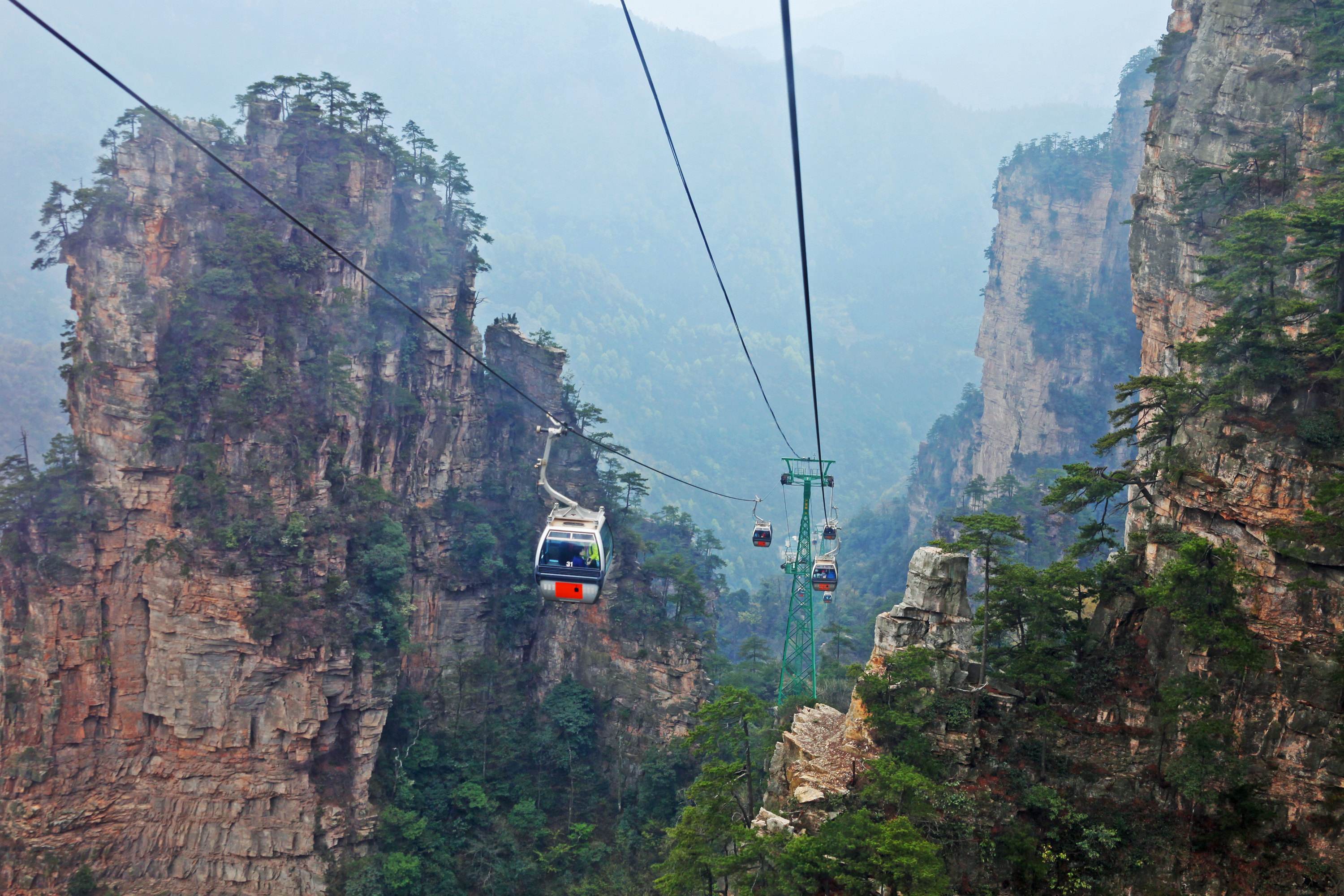 从火车上下来后,我们首先前往酒店放下行李,随后则在导游的安排与介绍下来到了本次游玩的第一个景区:天门山。缆车上山一直是这观光游玩的热门之选,当然我们也不愿错过。乘着缆车我们终于到达了天门山的顶端,不得不说,这场缆车之旅确实令我印象深刻:国内为数不多高差超过千米的索道之一,其中站到上站之间的局部斜度更高达38度,世界罕见,是国内局部斜度最大的索道,同时也是支架最多的索道。上升过程中,大家都“僵硬”地坐在座位上,生怕因为自己一点点的小动作会导致整辆缆车的剧烈抖动。