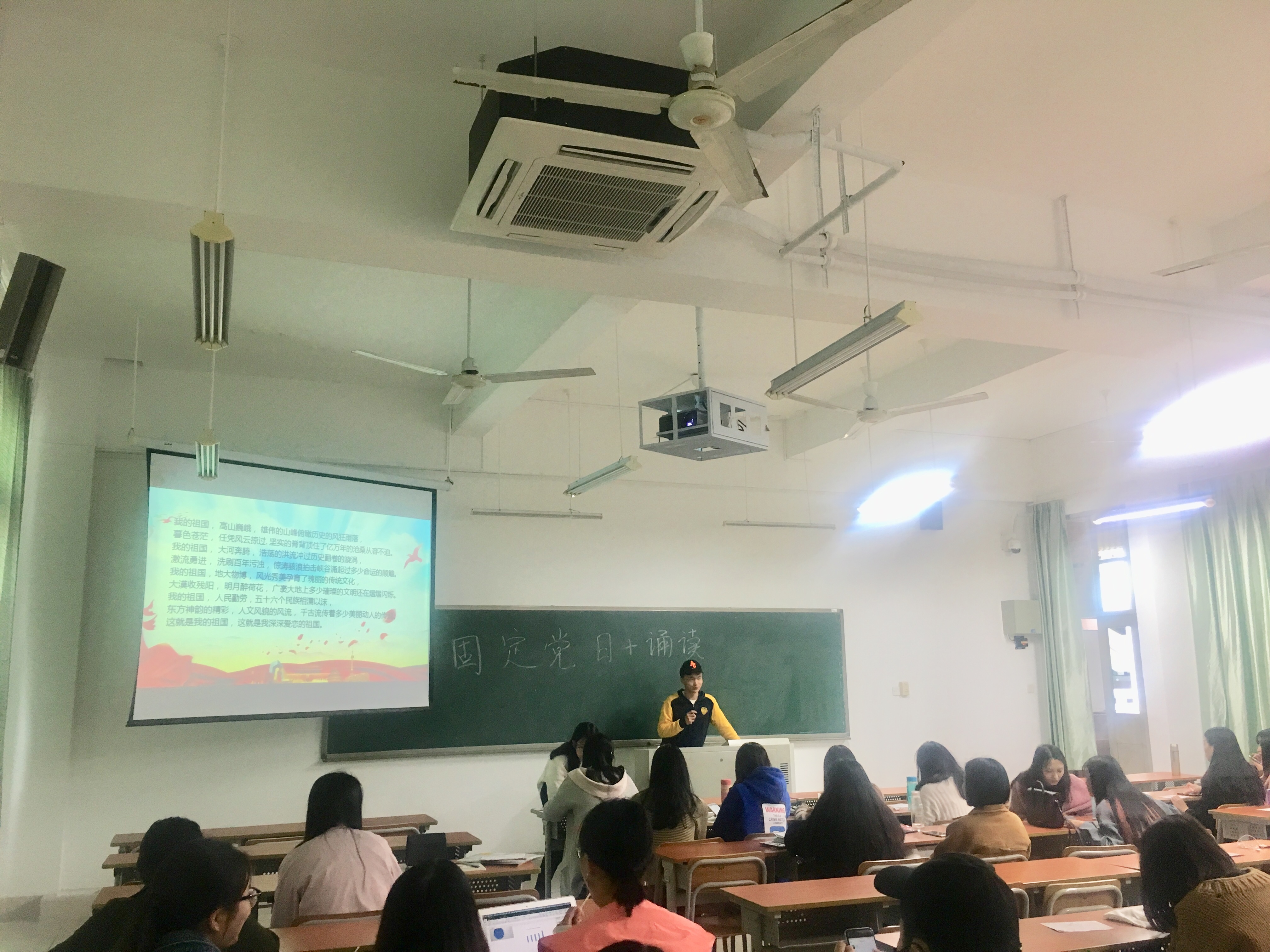 会议伊始,国贸学生党支部委员李亚博同志向在座的在校生党员、预备党员、发展对象和积极分子诵读了诗篇——《我的祖国》。此诗激情澎湃,包含中国人民对祖国的眷恋和拥有悠长历史的自豪并对未来的新生活的憧憬。与会同学不由自主地沉浸在诗词的美好意境里,并整齐有力地朗诵起来。