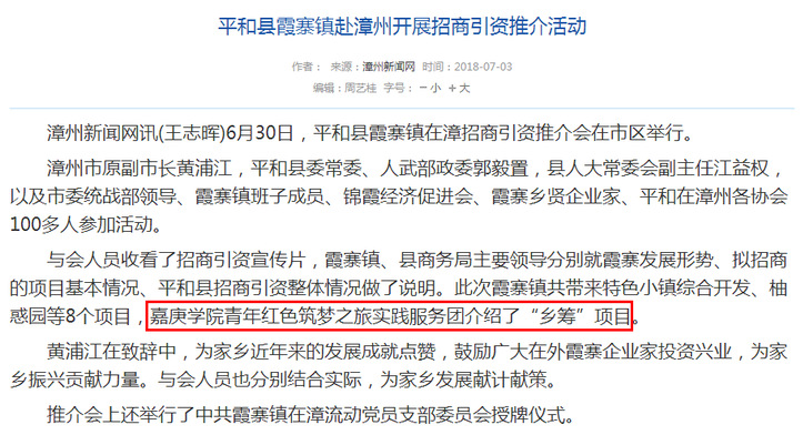 当天活动中,小分队主动与平和当地需求方进行了项目对接洽谈,收到了镇政府及3家企业的合作意向。其团队积极热血的面貌得到了与会政府领导的鼓励和支持,并被漳州新闻网报道。