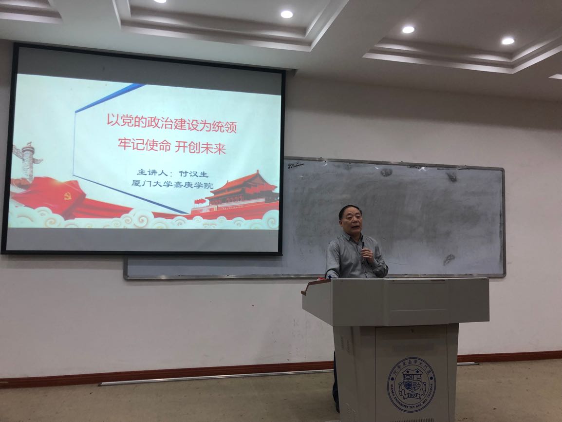 付汉生教授以“以党的政治建设为统领,牢记使命,开创未来”为主题,对新时代为什么以党的政治建设为统领及新时代党的政治建设的首要任务进行深入阐述。付汉生表示应自觉增强四个意识,维护中央权威,要不忘初心、牢记使命才能开创未来。付教授作为嘉庚学院十九大精神宣讲团的主力成员为国商院党总支带了一趟极具高度和深度的党课,在授课过程总引来了不少在场党员的阵阵掌声。