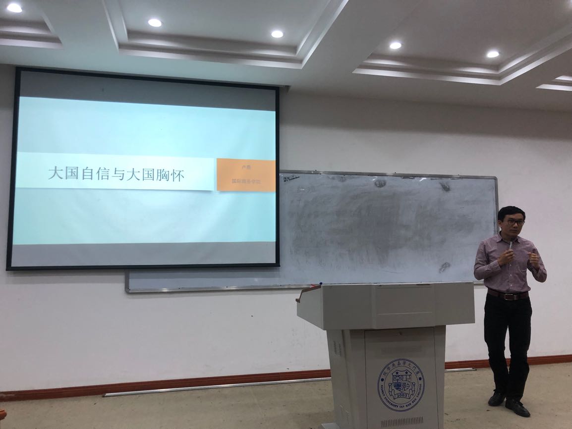 卢晨老师紧接着付汉生老师的高度从经济学角度,图文并茂地以大国自信和大国情怀为主题,对党在十九大以后的国家经济建设进行了详细解读,为党员老师和同学们带来了一堂生动的“经济学”党课。