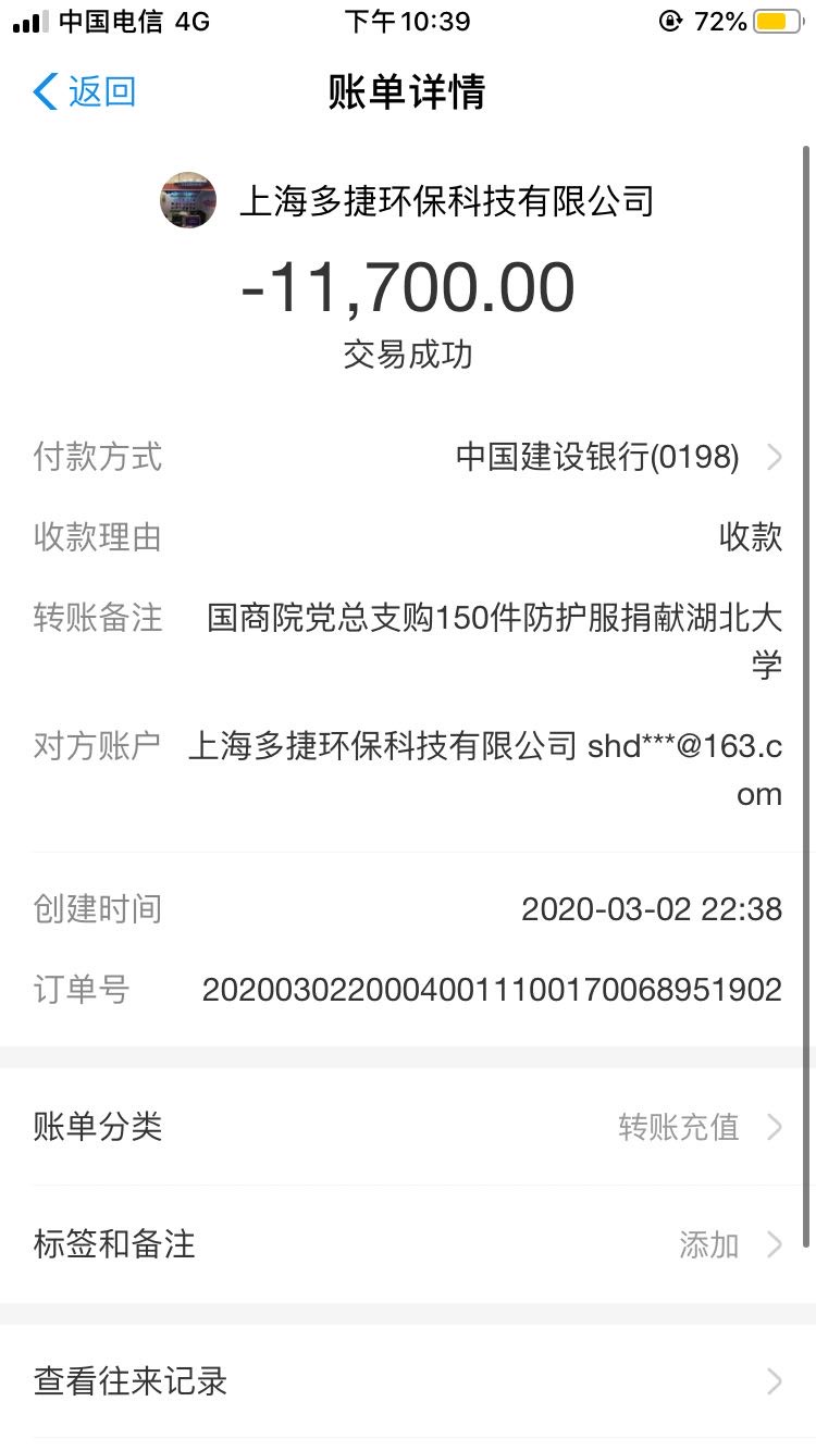 “不辞山路远,踏雪也相过”。3月3日上午,在教工党支部组织委员朱郑雯老师积极寻找货源的帮助下,国际商务学院党总支购买了4箱共200件防护服以最快的速度发往湖北大学抗疫指挥部。正忙于学校校园征用管理和下沉服务封闭社区、帮助运输生活物资的湖北大学党员教师们,对迅速得到紧缺的防护物资表示由衷感谢。而我们则要向他们学习的是即使担负很大感染风险,仍无所畏惧,冲锋在前,疫情不退我不退的初心和使命担当的精神。“沧海横流,方显英雄本色”, 中华民族从来都不会向苦难屈服!愿天佑中华,山河无恙,历万种磨难,涅槃重生。武汉必胜!湖北必胜!中国必胜!
