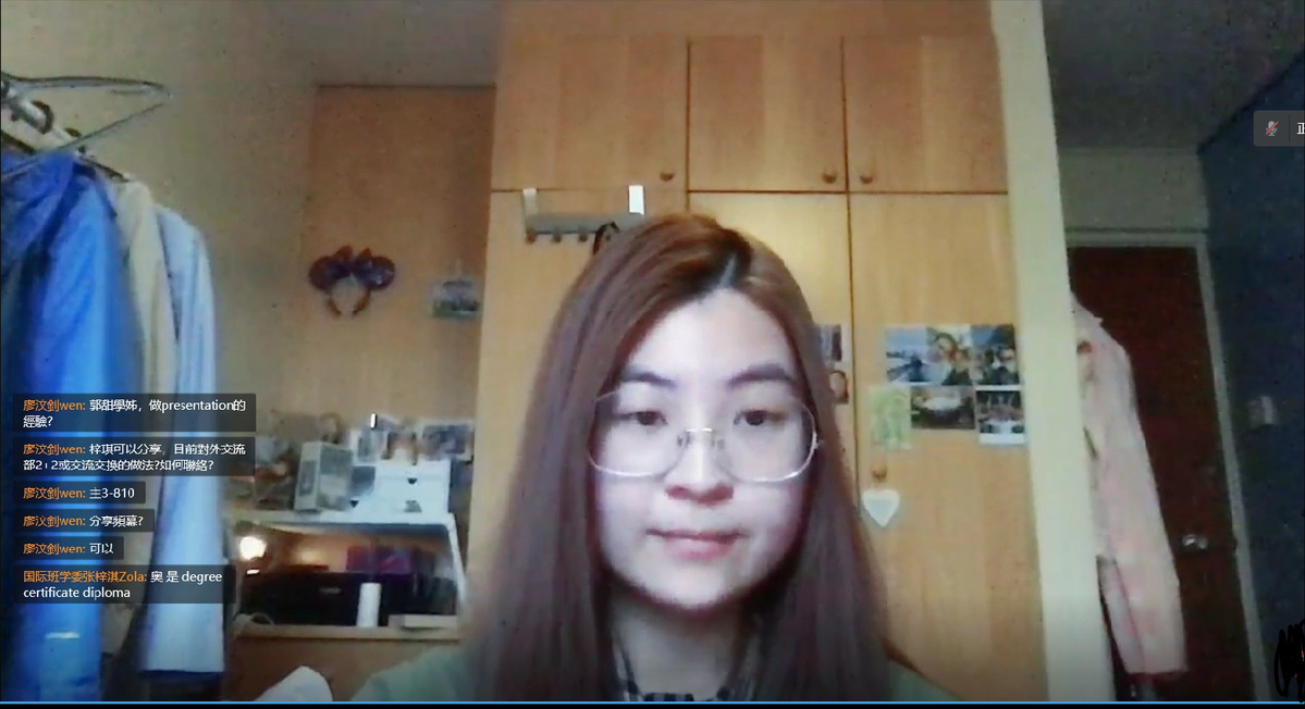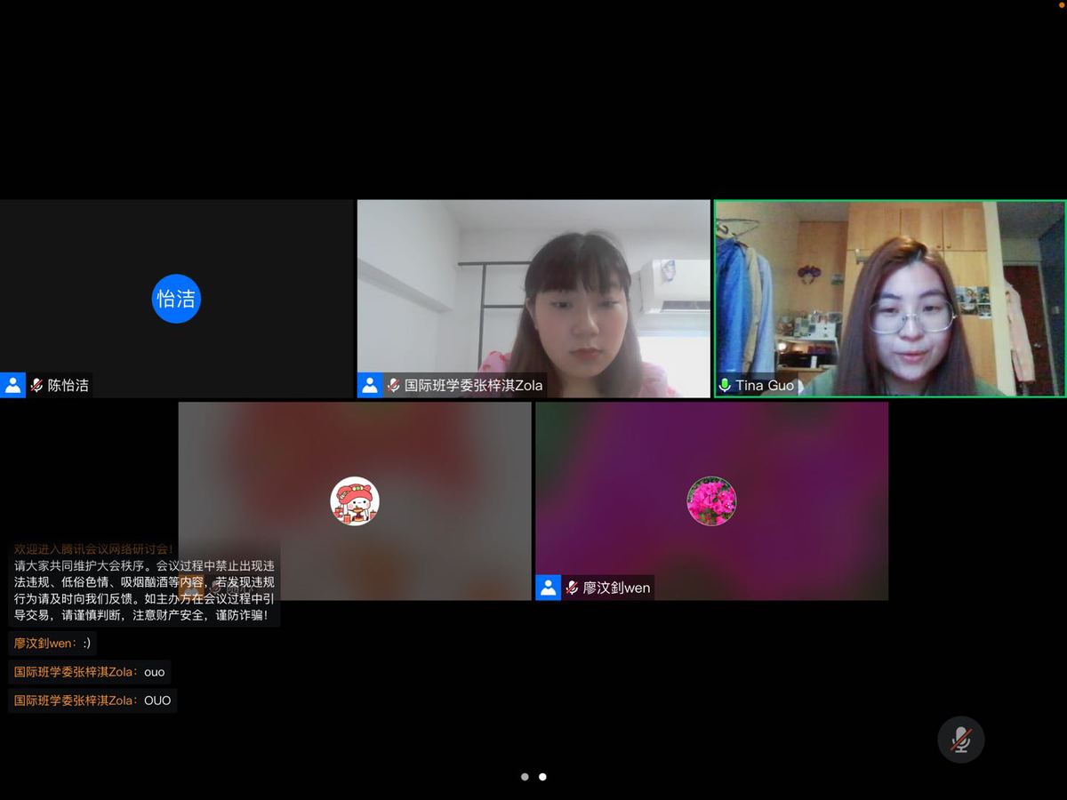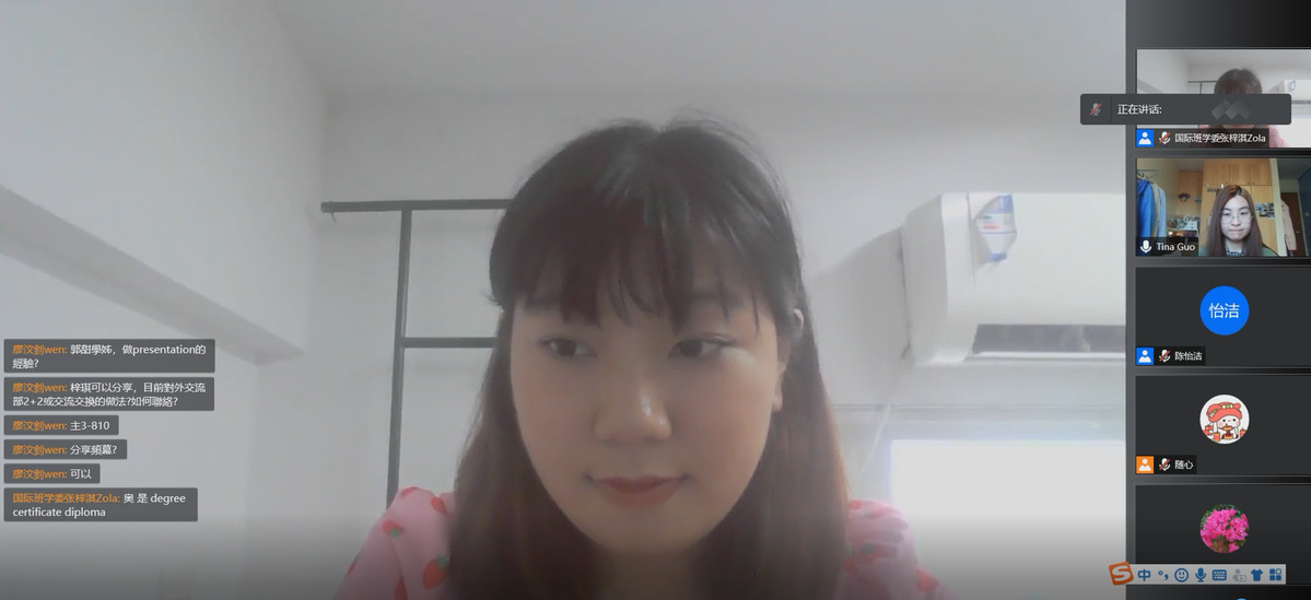 本次会议由2020国际班英语角负责人兼学习委员张梓淇同学主持,并邀请国际班毕业学生,参加我校“2+2”纽卡项目并在此后成功留英攻读硕士研究生学位的2018级金融学专业的郭甜学姐,作为本次分享会的特邀嘉宾。同时,上一期线上分享会的特邀嘉宾之一——国际商务学院对外交流与合作中心廖汶钊副主任也出席了本次会议。