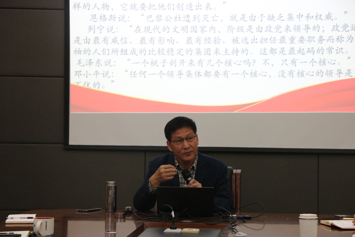 在“习近平新时代中国特色社会主义思想”解读环节,郑斌教授对起草过程和十个明确进行高度概括,讲解为什么习近平新时代中国特色社会主义思想是对中国特色社会主义建设规律认识深化和理论创新的重大贡献,阐释两个“确立”为何是历史和人民的选择,确立习近平同志党中央的核心、全党的核心地位,确立习近平新时代中国特色社会主义思想的指导地位,对推进中华民族伟大复兴历史进程具有决定性意义。