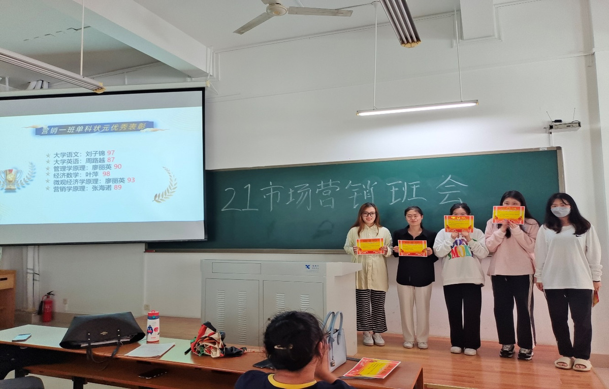 首先会议第一项内容,由辅导员魏佳老师对上学期同学成绩进行分析,本班较其他班优等生人数有稍微优势,要继续保持,为鼓励同学对单科状元以及班级前五名颁发奖状。