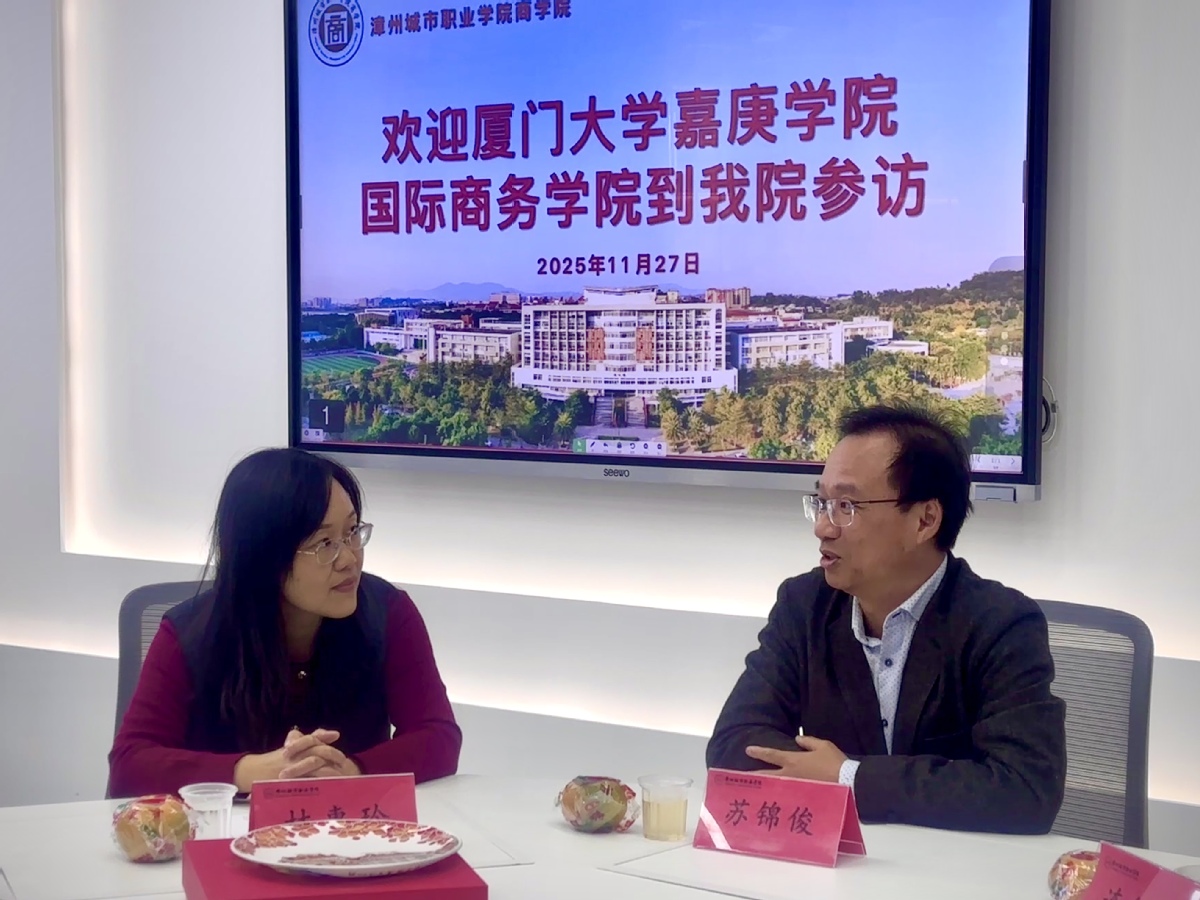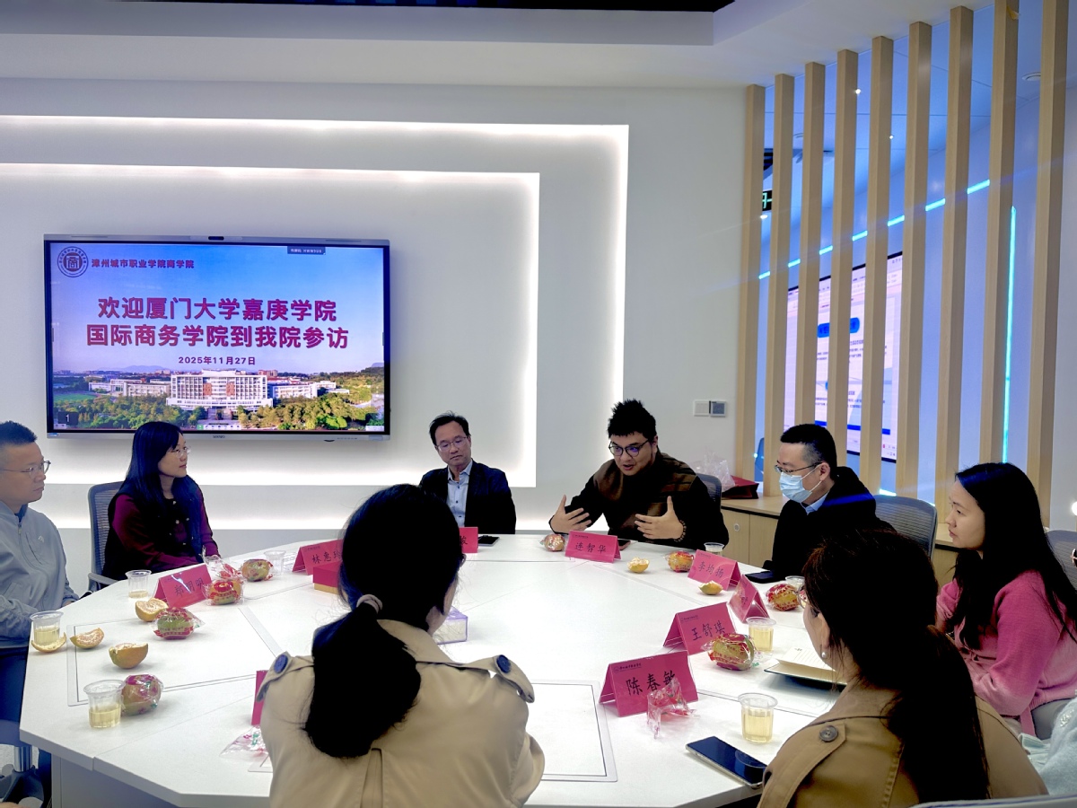 在漳州城市职业学院商学院,院长林惠玲热情接待了国际商务学院一行,并重点介绍了学院智慧电商实训中心的建设与运行情况。双方随后举行座谈,围绕商科专业未来发展方向、学生实践能力培养及校企合作模式等议题进行了深入探讨,共同探索适应数字经济时代要求的商科教育新路径。