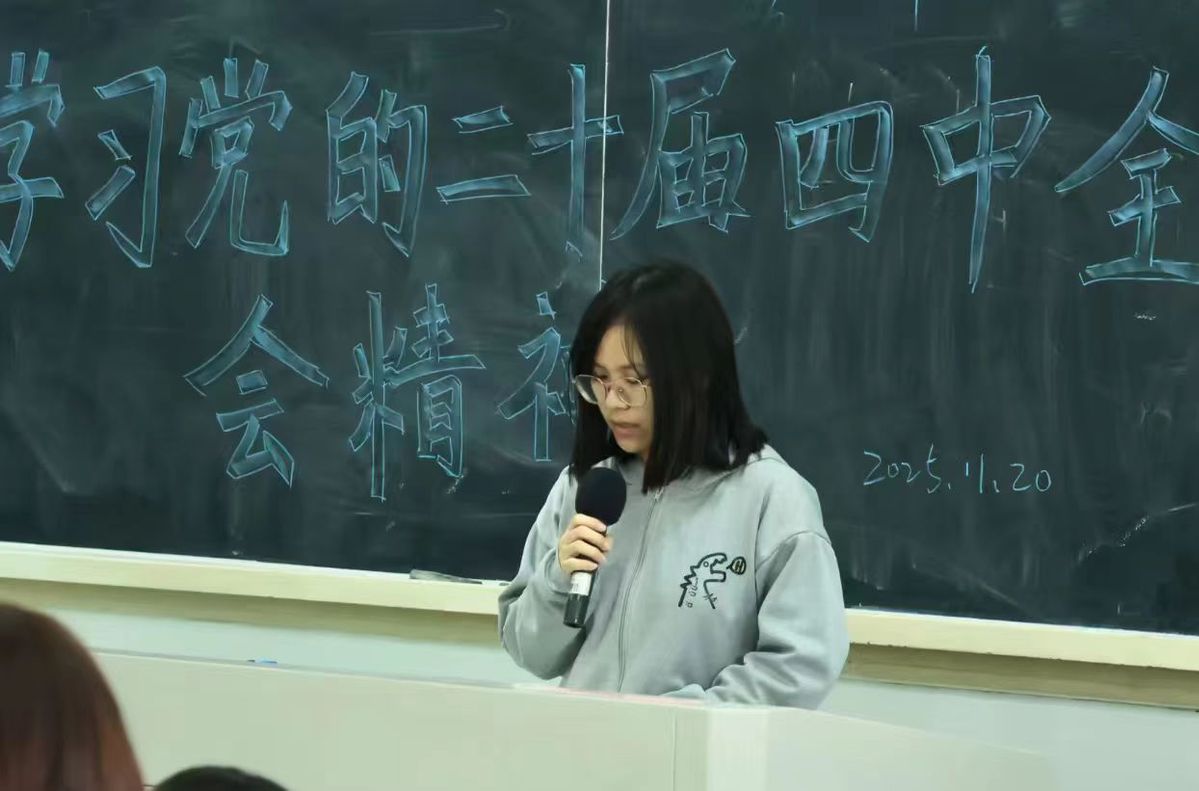 第一项议程,李昕雅从会议概况与时代意义、全会核心成果与总体要求、分领域战略部署与实践路径、坚持党的领导与全面从严治党、如何贯彻落实全会精神五个方面进行了宣讲。她向同学们展示了我国青年在不同领域践行全会精神、为国家奋斗的生动实践,进一步阐释了各族青年听从党和人民召唤、贯彻落实全会精神的时代要求。随后,她带领大家结合全会对青年工作的相关部署,解读了如何将个人成长与国家发展紧密结合,让大家理解“把思想共识转化为服务‘十五五’规划实施实干行动”的具体路径,引导同学们将个人梦想与家国命运相连,以实际行动响应全会号召。
