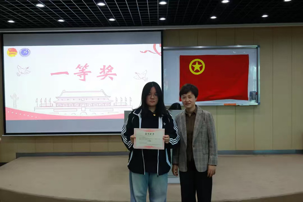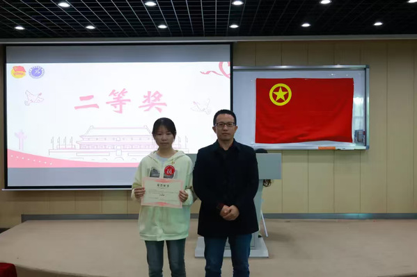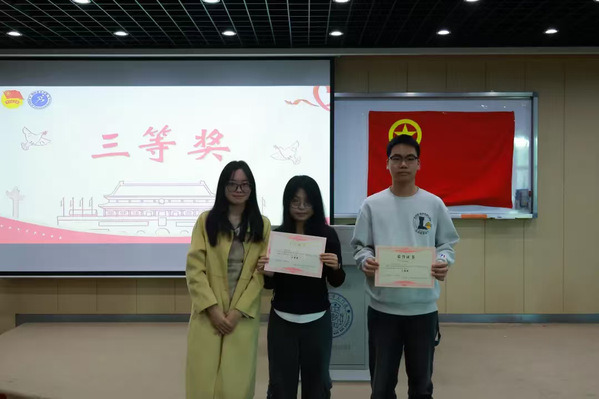 随后,主持人宣读竞赛最终成绩。经评定,25级国商(2)班“党团先锋队”荣获一等奖,25级国贸(3)班“神是无法匹配队”获二等奖,25级国贸(1)班“跟党走就队”、25级营销(2)班“啊对对对队”获三等奖。党总支书记刘莉、党总支副书记辛东亮、团总支指导老师刘燕燕分别为获奖队伍颁奖,并与全体参赛队员合影留念。