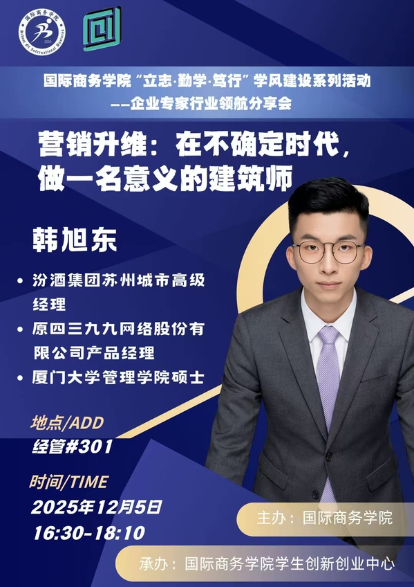 为帮助我院学生明确发展路径、破解成长困惑、搭建与行业前辈的沟通桥梁,国际商务学院于12月5日下午16:30在经管#301 举办“企业家走进校园”系列讲座。本次讲座由双创中心承办,特邀汾酒集团苏州城市高级经理韩旭东主讲。国际商务学院副院长连智华、辅导员左伟唯、教学秘书丁家媛及我院同学共同出席本次活动。