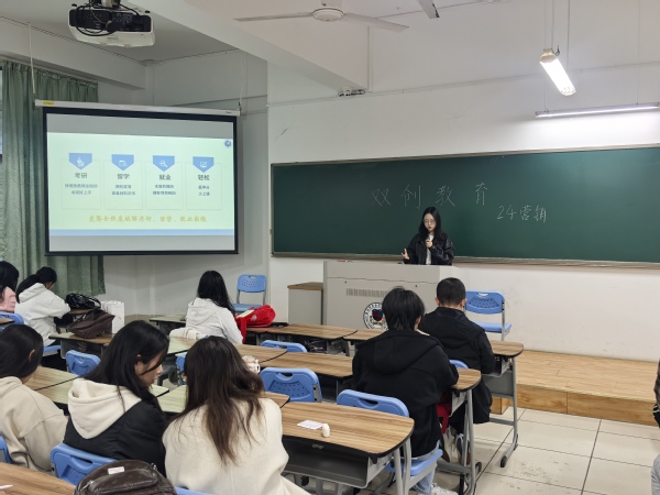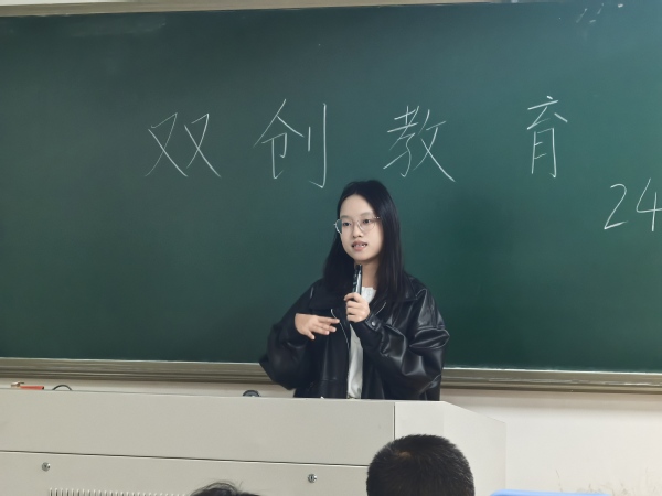 随后,2023级市场营销专业方晓蕊学姐带来双创经验分享。作为学院双创工作的参与者和组织者,学姐以个人经历为引,展示了其在“中国国际大学生创新大赛”等赛事中斩获国家级、省级奖项的成果,并从“赛前准备与赛事选择”“团队协作与能力培养”等维度,分享了竞赛对思维塑造、履历丰富度提升的价值,希望同学们理性参与竞赛、平衡学业生活,鼓励大家在实践中探索自身更多可能。
