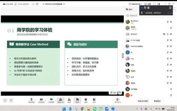 最后,针对商科学习、加拿大留学、职业选择、商业竞赛等方面,学姐给出了针对性建议,对比国内外文化差异,建议大家不断提升自身综合能力。并且在即时问答环节,通过回答同学们各自的问题,打破了大家对职业路径和学习生活的固有认知。同学们不仅在知识层面得到提升,更在自我认知、适应变化、主动探索等方面获得了启发,为未来的学习与职业规划提供了清晰的方向。