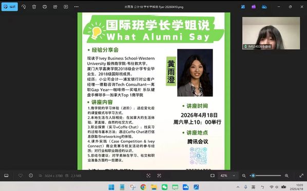 2026年4月18日,国际班“学长学姐说”活动通过腾讯会议顺利举办。本次活动由国际商务学院国际交流与合作中心副主任廖汶钊老师进行引言,24级信管专业李婕琦同学主持,邀请到2018级会计学专业黄雨澄学姐进行分享。围绕商学院学习体验、加拿大学习生活、职业探索、coffee chat信息获取及商业竞赛实践等话题,分享自身成长经历与宝贵感悟。