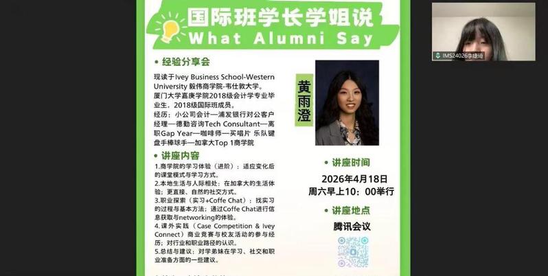 2026年4月18日,国际班“学长学姐说”活动通过腾讯会议顺利举办。本次活动由国际商务学院国际交流与合作中心副主任廖汶钊老师进行引言,24级信管专业李婕琦同学主持,邀请到2018级会计学专业黄雨澄学姐进行分享。围绕商学院学习体验、加拿大学习生活、职业探索、coffee chat信息获取及商业竞赛实践等话题,分享自身成长经历与宝贵感悟。分享会上,黄雨澄学姐首先讲述了自己的职业探索历程,职业路径从基层会计、浦发银行对公客户经...