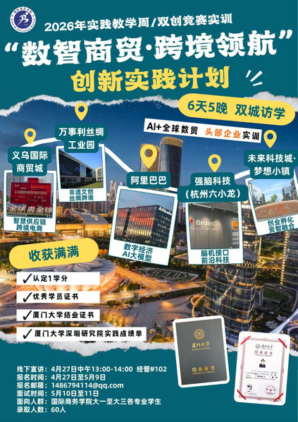 还在为实践学分发愁?还在为简历缺少硬核经历、留学申请无亮眼背书焦虑?还在课本里学习跨境商贸,却从未走进真实的产业一线?国际商务学院依托2026实践教学周,与厦门大学深圳研究院共建「数智商贸・跨境领航」创新实践计划,专为大一至大三学生打造,走出课堂、走进产业,用一次实地实践,解锁学分、证书、技能、履历四重收获,培养具备全球视野、数字素养与实战能力的应用型商科人才。实践亮点:本次实践将深度对接杭州数字经济...